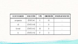 Atributos del identificador. Puntero a la posición de memoria asignada. La clave puede sustituirse por un puntero. Los identificadores pueden estar empaquetados. La longitud del identificador puede especificarse en la tabla o delante del nombre, o ser implícita.